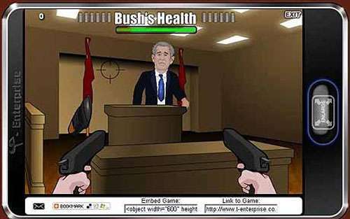 據(jù)了解,《布什靴營》的玩家可扮演一名保安特工,玩家必須在突然擲出的鞋擊中總統(tǒng)之前開槍把鞋擊落。玩家們只要滑動鼠標(biāo),瞄準(zhǔn)槍上的十字絲,然后開火就行了。每次布什總統(tǒng)誤中槍火或被鞋子擊中,他的“生命”便會減少。當(dāng)生命減至零時(shí)玩家便輸了。