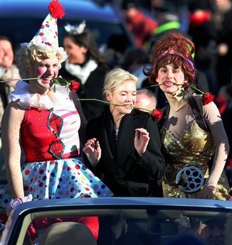 中新網(wǎng)2月6日電 據(jù)美聯(lián)社報道,5日哈佛大學(xué)的速食布丁劇團(tuán)將速食布丁年度女性大獎授予女星蕾妮•齊薇格。蕾妮•齊薇格按照以往慣例,帶領(lǐng)一群男扮女裝的學(xué)生們在哈佛校園中進(jìn)行一場盛大游行。