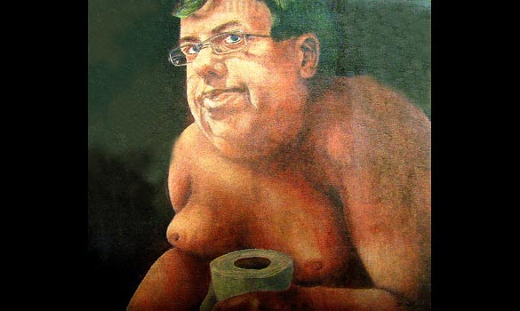 在愛爾蘭皇家海柏尼恩學(xué)院展出的畫中,考恩挺著圓鼓鼓的大肚子,左手拎著一條藍色內(nèi)褲。在愛爾蘭國家藝?yán)日钩龅漠嬛,考恩裸露上身,左手攥著一卷衛(wèi)生紙,看起來正在蹲馬桶。兩幅畫展出不到20分鐘,立即引發(fā)轟動,有關(guān)部門勒令畫廊立即將畫作拿下。