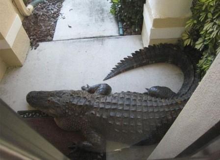中新網(wǎng)4月29日電 據(jù)英國媒體報(bào)道,日前在佛羅里達(dá)州郊區(qū)的一家住戶門外驚現(xiàn)一條長達(dá)11英尺的鱷魚,這家主人被困屋內(nèi)緊急報(bào)警,野生動(dòng)物專家用了一個(gè)小時(shí)才把這位“不速之客”請(qǐng)走。