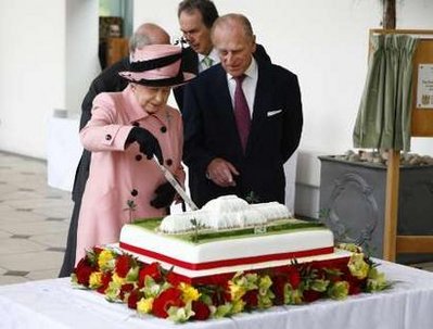 5日女王和其丈夫到英國“巧園植物園”出席巧園成立250周年慶祝會。園方準(zhǔn)備了一個長方形大蛋糕,下面是鮮花,上面是白色奶油。頂上做成巧園最有名的建筑,大溫室的樣子。蛋糕店老板把刀交給女王。女王一拿起刀,菲利普就在旁邊說,“好好切,用點(diǎn)力”。