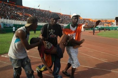 科特迪瓦內(nèi)政部長(zhǎng)塔戈羅表示,在科特迪瓦隊(duì)主場(chǎng)對(duì)陣馬拉維隊(duì)的比賽開(kāi)始前,球迷互相推搡,最后爆發(fā)騷亂,發(fā)生踩踏事件。塔戈羅稱(chēng):“因?yàn)楸荣惣磳㈤_(kāi)始,球迷們爭(zhēng)搶著入場(chǎng),每個(gè)人都想進(jìn)去(導(dǎo)致事故發(fā)生)!