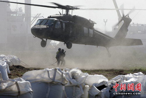 美軍出動黑鷹直升機空投了一噸沙袋在海岸,以保護美國南部濱海區(qū)重要的濕地。