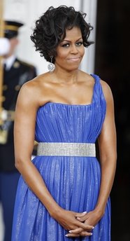 當(dāng)晚,奧巴馬夫人米歇爾再次閃亮登場,其著裝打扮又被眾媒體拿來評(píng)點(diǎn)一番。米歇爾穿了亮藍(lán)色單肩拖地長裙,腰間系上銀色腰帶,并佩戴了銀色耳環(huán)。
