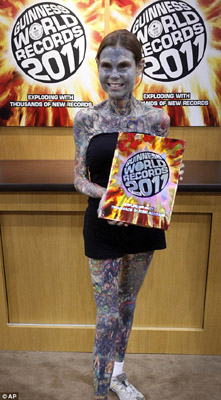 中新網5月27日電 據(jù)英國媒體報道,美國女孩希努斯(Julia Gnuse)全身95%都覆蓋著五顏六色的紋身。她也被吉尼斯世界紀錄評為世界上紋身最多的女人。5月26日,她出席了紐約圖書博覽會,也展示了自己身上的紋身。