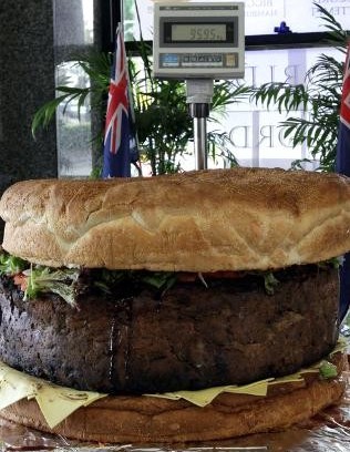 據(jù)報(bào)道,這個(gè)漢堡包總共重將近100公斤,打破了由美國(guó)密歇根州84公斤漢堡包創(chuàng)下的紀(jì)錄。