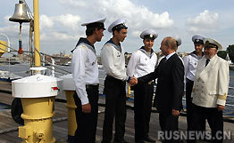 俄總理普京在圣彼得堡參觀“和平號”帆船(圖)