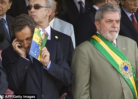 法國總統(tǒng)薩科齊6日至7日對巴西進行國事訪問,并應邀出席了巴西獨立節(jié)的慶祝及閱兵活動。閱兵活動中,薩科齊偷接電話被媒體逮了個正著。試圖用宣傳單擋住自己在打電話的舉動,可謂是“欲蓋彌彰”。