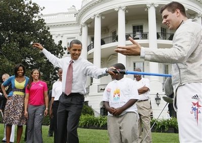 中新網(wǎng)9月17日電 綜合媒體報(bào)道,奧巴馬16日在白宮南草坪“耍劍”,他還與曾在北京奧運(yùn)會擊劍項(xiàng)目中獲得銀牌的莫豪斯較量起來。