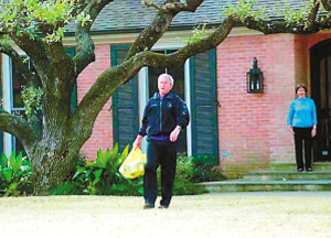布什經常被勞拉打發(fā)上街買雜物,或者帶著寵物狗巴尼在社區(qū)閑逛,提著塑料袋親自為狗“善后”。閑暇時間布什還經常和勞拉一起去看看球賽,參加社區(qū)活動。