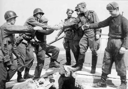 1945年4月25日,一支美軍偵察隊(duì)與一隊(duì)蘇軍在德國城市托爾高(Torgau)南部易北河畔的一座橋上勝利會(huì)師,一幅美蘇兩軍士兵握手的照片從此傳遍世界,成為反法西斯戰(zhàn)爭歐洲戰(zhàn)場(chǎng)出現(xiàn)勝利曙光,希特勒政權(quán)即將滅亡的最廣為人知的象征之一。