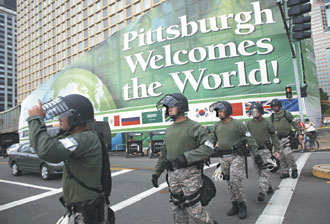 據(jù)當(dāng)?shù)鼐浇榻B,為確保二十國集團(tuán)金融峰會的安全,有關(guān)方面部署了將近5000人的警力,其中包括約2500名國民警衛(wèi)隊員、1200名州警、870多名匹茲堡市警員以及其他執(zhí)法人員。
