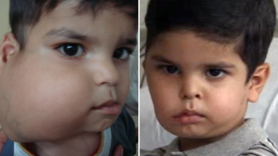 中新網(wǎng)8月6日電 據(jù)英國(guó)天空新聞臺(tái)報(bào)道,來(lái)自伊拉克的3歲男孩賽義夫•巴賽木剛剛在倫敦的圣喬治醫(yī)院接受了三項(xiàng)手術(shù),其中最長(zhǎng)的一項(xiàng)長(zhǎng)達(dá)九個(gè)小時(shí)。手術(shù)后,他擺脫了臉上一個(gè)巨大腫瘤的困擾。
