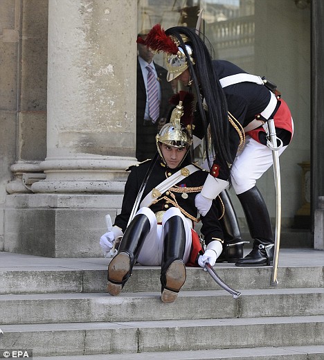 22日,法國(guó)總統(tǒng)薩科齊和夫人布魯尼接待前來(lái)法國(guó)訪問(wèn)的卡塔爾埃米爾夫婦。在結(jié)束各項(xiàng)接待禮儀后,薩科齊牽著布呂尼的手走進(jìn)愛(ài)麗舍宮。而在與守候在外的記者告別前,布魯尼仍不忘微笑揮手,這時(shí)的前超級(jí)名?芍^“回眸一笑百媚生”。正當(dāng)記者們狂按相機(jī)時(shí),站在愛(ài)麗舍宮正門外臺(tái)階上的一名衛(wèi)兵也“激動(dòng)的不行”,以致眼神發(fā)直,腿軟倒地,另外一名衛(wèi)兵見(jiàn)狀趕緊上前攙扶。