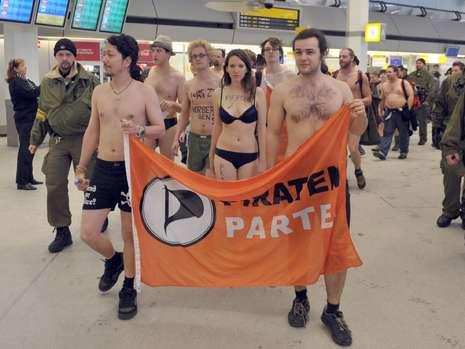 據(jù)德國《圖片報(bào)》1月10日?qǐng)?bào)道,當(dāng)?shù)貢r(shí)間周日下午,德國“海盜黨”(一個(gè)宣傳保護(hù)個(gè)人隱私的小黨派)的約15名成員在柏林機(jī)場A航站樓半裸抗議政府引進(jìn)更為嚴(yán)格的機(jī)場身體掃描設(shè)備。
