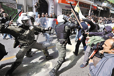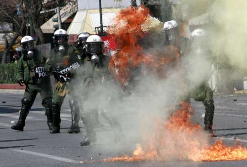 其中在雅典中部有三萬(wàn)多人示威,于國(guó)會(huì)大樓外等多處地方,示威者向防暴警察投擲石塊和汽油彈,放火燒車和垃圾桶,又破壞銀行、珠寶店、戲院等10多間商店,警方發(fā)射催淚彈和手榴彈驅(qū)散人群。