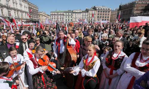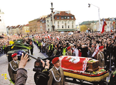 當(dāng)靈車緩慢穿過克拉科夫狹窄街道時,哀悼者為卡欽斯基夫婦鼓掌、拋花和揮舞波蘭國旗?J斯基夫婦的遺體,是用飛機從華沙運抵這里的。