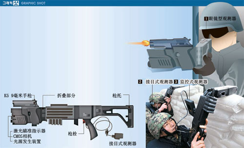 拐角槍是將既有步槍的槍身折疊后,在槍的末端安裝口徑9毫米的K5手槍。為能夠確認(rèn)墻外的目標(biāo)并瞄準(zhǔn),安裝了數(shù)碼相機(jī)和激光目標(biāo)指示器。據(jù)此,戰(zhàn)斗兵在墻后擺好拐角槍,通過觀看數(shù)碼半導(dǎo)體相機(jī)拍攝的影像對準(zhǔn)激光目標(biāo)指示器然后進(jìn)行射擊。有效射程為50米,可左右折疊60度進(jìn)行自由射擊。應(yīng)用于實(shí)戰(zhàn)還將需要1到2年的時間。