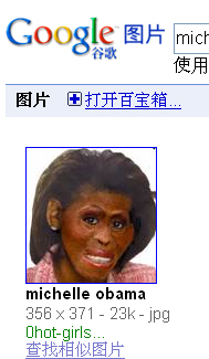 中新網(wǎng)11月25日電 據(jù)美國(guó)媒體報(bào)道,近日有網(wǎng)民發(fā)現(xiàn),在Google圖片搜索中輸入奧巴馬夫人的名字Michelle Obama時(shí),第一張彈出來的照片竟遭人丑化,米歇爾被PS成了猩猩臉。