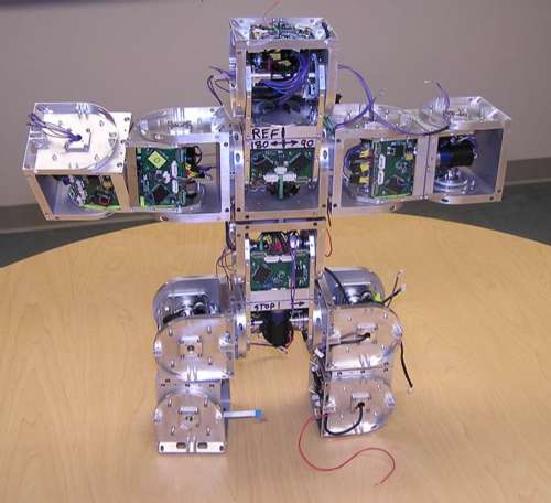 南加州大學(xué)多形態(tài)機(jī)器人學(xué)實(shí)驗(yàn)室兩年多前開始研發(fā)這款“超級機(jī)械人”(Superbot)。它是由一百塊模塊組成,目前僅完成了頭二十塊。它雖然不能真的像《變形金剛》電影中的機(jī)械人那樣變成貨車或“F-22”戰(zhàn)斗機(jī),但它的變身能力仍令人咋舌:它可以“長出”一對、兩對或三對“腿子”,可以像蛇那樣滑行,也可以像毛蟲那樣蠕動。其中六塊模塊可以形成履帶,有些組合還可以舞動繩子。研究主管沈偉明(音譯)稱:“它要攀爬時可以長出腿子,要下山時則可以變成球狀或者索性滾下去。”與賓夕法尼亞大學(xué)去年展出的模塊機(jī)械人相似,它解體后能夠自我修復(fù)和自我重裝:每個模塊儼如一個獨(dú)立的機(jī)械人,而且可以利用紅外線和無線電訊息互相“對話”;它們又會一直評估周遭情況,包括附近有沒有其它模塊,以及它們本身是否需要變成手腳。