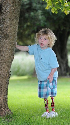 中新網(wǎng)7月29日電 英國一名3歲男童前年患上腦膜炎,要切除雙腿,最近他裝上1.25萬英鎊的仿生義肢,并重新學(xué)會(huì)走路。