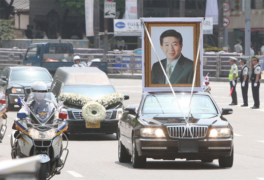 當(dāng)?shù)貢r間29日凌晨5時,盧武鉉的出殯儀式結(jié)束后,靈車6時許離開慶尚南道金海市進泳邑峰下村,4小時50分鐘后來到首爾。