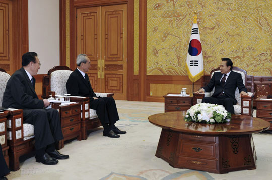 李明博從當(dāng)天上午9時開始接見朝鮮勞動黨中央書記金己男和統(tǒng)一戰(zhàn)線部部長金養(yǎng)建等一行,就最近的朝韓關(guān)系廣泛地交換了意見。