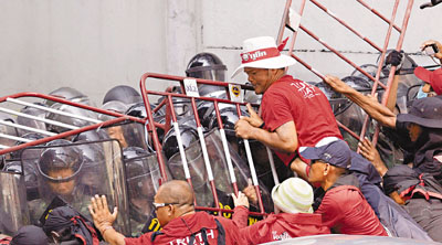 昨日早上9時,約1萬名紅衫軍在5星級酒店四季酒店前面的Rajdamri路集會,警方出動5部運(yùn)送囚犯的警車堵塞路面,阻止他們離開曼谷拉差巴頌路的交叉路口,部分紅衫軍企圖沖破約1000名軍警組成的防線,雙方爆發(fā)沖突,互相推撞,示威者又向防暴警察投擲雞蛋和膠瓶,最終成功沖破軍警封鎖直闖“禁區(qū)”。