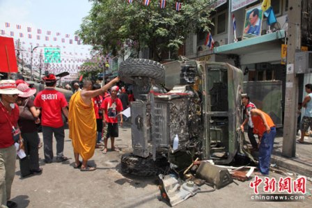晨光漸現(xiàn),沖突現(xiàn)場(chǎng)遍地防暴盾牌、彈殼、石塊和血泊漸漸顯現(xiàn)出來(lái)!凹t衫軍”重返他們盤踞的市區(qū),向大家展示著他們從軍隊(duì)那兒搶來(lái)的武器,包括步槍和大口徑機(jī)槍子彈。超過(guò)6輛軍車、裝甲運(yùn)兵車等遭抗議者破壞!凹t衫軍”領(lǐng)袖之一乍都蓬說(shuō),阿披實(shí)的雙手已因沖突而“沾滿鮮血”。他在一個(gè)演講臺(tái)上說(shuō):“‘紅衫軍’是永遠(yuǎn)都不會(huì)與‘劊子手’談判的”。他認(rèn)為,“雖然路途崎嶇,又充滿障礙,但把民主帶到這個(gè)國(guó)家,從而為死者增光,是我們的責(zé)任!