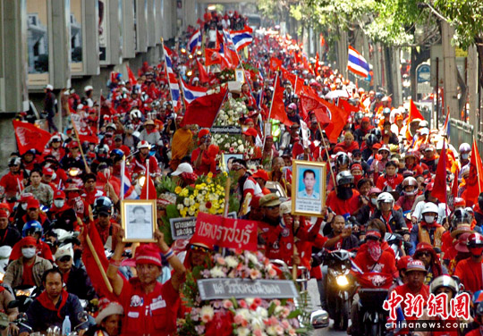 12日早上,紅衫軍在曼谷市區(qū)抬著11個(gè)棺材舉行游行,稱里面放著死于10日暴力沖突的喪生者遺體,借此向政府施壓,要求阿披實(shí)下臺。