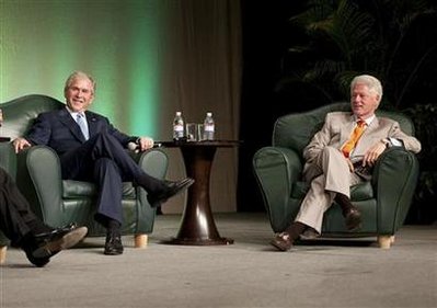 克林頓卸任后,多次與布什的父親、即前總統(tǒng)老布什合作,例如替南亞海嘯及超級(jí)颶風(fēng)“卡特里娜”天災(zāi)的災(zāi)民籌款,兩人有一段時(shí)間經(jīng)常走在一起。布什開玩笑道,不知道自己的父親花了多少時(shí)間與克林頓同場亮相。