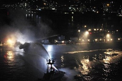 綜合此間報(bào)道,事發(fā)現(xiàn)場(chǎng)位于連接福岡縣北九州市與山口縣下關(guān)市兩市的關(guān)門(mén)橋正西約一公里的海面。兩船相撞后,KURAMA號(hào)的船頭和“CARINA STAR”號(hào)的集裝箱同時(shí)起火,火勢(shì)在半個(gè)多小時(shí)后得到控制,至少有三名自衛(wèi)隊(duì)成員在救火過(guò)程中受傷。