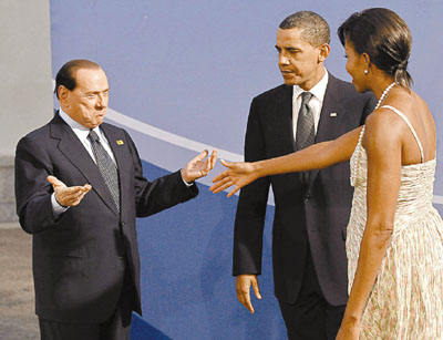 據(jù)香港《文匯報(bào)》報(bào)道,晚宴上,奧巴馬夫婦以東道主身份負(fù)責(zé)迎賓,被意大利媒體稱為“性上癮”的老貝見到美國第一夫人米歇爾時(shí)顯得相當(dāng)高興,伸出雙臂示意互相擁抱。誰知米歇爾遠(yuǎn)遠(yuǎn)伸出一只手,示意握手打招呼,令場面顯得很尷尬。更值得注意的是,站在一旁的奧巴馬一臉冷漠,斜睨老貝,顯得十分警惕。