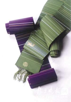 記者看到,這是兩條精心緙制的和服腰帶,一條為青瓷色,另外一條為羅蘭紫,寬度為17.1厘米,長度為4.18米,其中青瓷色腰帶的前端用金絲緙有鳩山家族“家紋”(在日本,每個家族都有一個家紋,也叫“平安紋”,它相當于我國的字號),在腰帶中部,還緙有鳩山首相喜愛的金魚圖案,也是用18K金絲緙制而成的。記者獲悉,鳩山首相的兩條和服腰帶,出自南通宣和緙絲研制所緙絲大師王玉祥老先生之手。緙絲是中國最傳統(tǒng)的經緯交織絲織品,因其獨特的藝術魅力為歷代帝王所追捧,緙絲分為“本緙絲”和“明緙絲”,南通緙絲就是“本緙絲”,上世紀70年代末,王玉祥又從鄰國日本學來中國唐宋緙絲流派,對“本緙絲”技藝進行了完善。