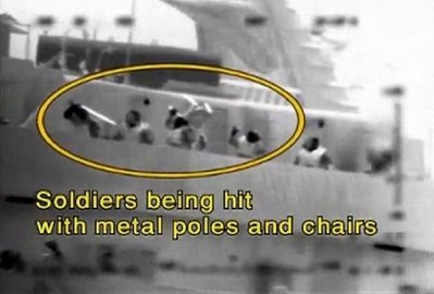 以軍發(fā)布長1分鐘的紅外線錄影片段,并配上英文字幕上載至YouTube網(wǎng)站。片段可見,當首名士兵從直升機游繩而下,甫踏足土耳其救援船“馬維.馬爾馬拉號”甲板之際,一名船員便向他投擲閃光彈,甲板上的人紛找掩護或伏在地上。這時候,有船員抓住以軍的繩子搖晃,一名士兵似脫手掉下。他們又把繩子縛在甲板,企圖扯下直升機。降落甲板計程車兵遭佩戴防毒面具的船員攻擊。字幕稱:“士兵遭人以金屬棒和椅子毆打!贝瑔T又企圖搶奪士兵的武器,一名士兵更被多名船員合力抓住雙腿,從甲板拋下!