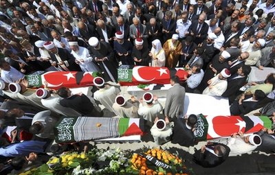 周四(3日),九名死者的尸體被從以色列運回土耳其。450多名活動人士也一同抵達,他們受到英雄般的歡迎。九名死者都是土耳其人或出生在土耳其,他們的棺材上覆蓋著土耳其和巴勒斯坦的國旗。