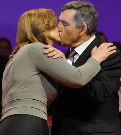布朗夫人登工黨大會講臺獻吻。