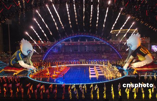 十月二十六日晚,中華人民共和國國旗和澳門特別行政區(qū)區(qū)旗升起在澳門運動場,第二屆亞洲室內(nèi)運動會開幕式隆重舉行。澳門特首何厚鏵、國際奧委會主席羅格等嘉賓出席開幕式。開幕式上舉行了“和諧澳門,快樂竟技”大型文體匯演。第二屆亞洲室內(nèi)運動會將舉行十七個大項,一百五十一個小項非奧運項目比賽和三個示范項目表演,是澳門主辦的規(guī)模最大,要求最高,比賽項目最多的國際綜合運動會。 中新社發(fā) 史利 攝