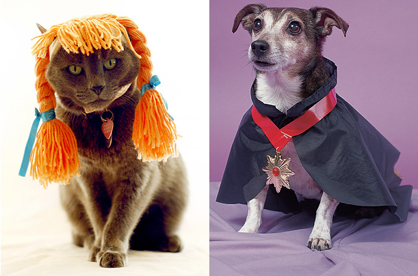 圖片二:左邊一副圖片中,一只可愛(ài)的小貓頭頂一副麻花辮假發(fā),也許它想用它來(lái)嚇唬其他動(dòng)物,可它沒(méi)想到這樣讓它看起來(lái)更可愛(ài);在右邊一幅圖片中,一只小狗打扮成吸血鬼的模樣,威風(fēng)凜凜的可愛(ài)模樣足以嚇走別人么?(鐘巖)