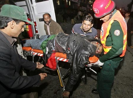中新網(wǎng)12月27日電 據(jù)法新社報(bào)道,巴基斯坦前總理貝-布托今日在競選集會(huì)上遭到炸彈襲擊,不治身亡。圖為救援人員搶救傷者。(關(guān)新)