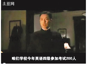 于是,惡搞版《色,戒》出爐了:易先生變成梁校長,收到副官的“四級考試有人作弊”報告后,下令補考否則不能畢業(yè),而王力宏及一幫掙扎在四級苦海中的學(xué)生毅然決定派王佳芝作弊,找個補考老師(庹宗華),實行“一人吃飽,全家不餓”的作弊方式,但校方道高一丈,派出“無間道”班底的監(jiān)聽員,最終一網(wǎng)打盡,王佳芝與鄺裕民被處以開除學(xué)籍的處分。