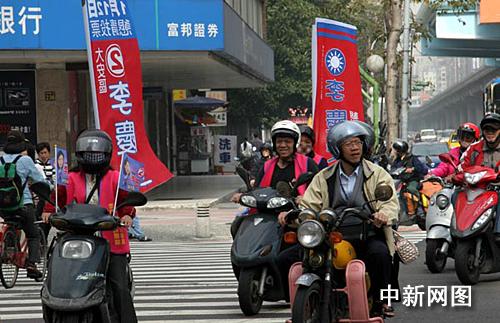 一月十日,一名“立委”候選人的選務(wù)團(tuán)隊(duì),將拉票彩旗插在摩托車上穿梭于臺北街頭造勢。 作者:孫自法