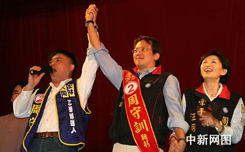 一月十日晚,臺北市市長郝龍斌(左)為“立委”候選人周守訓(xùn)參選拉票造勢。 作者:孫自法