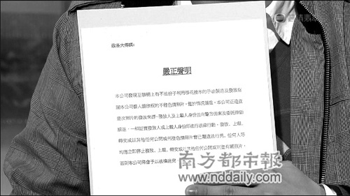 本公司發(fā)現(xiàn)互聯(lián)網(wǎng)上有不法分子利用移花接木的手法制造及發(fā)放有關(guān)本公司藝人鐘欣桐的不雅色情照片,鑒于情況嚴(yán)重,本公司正追查是次照片的發(fā)放來(lái)源、發(fā)放人及上載人身份并向警方備案及委托律師跟進(jìn),一經(jīng)證實(shí)發(fā)放人或上載人身份即進(jìn)行法律行動(dòng)。發(fā)放、上載、轉(zhuǎn)交或以其他任何公開或刊登色情照片實(shí)已屬違法行為,任何人等均應(yīng)立即停止發(fā)放、上載、轉(zhuǎn)交或以其他任何公開或刊登有關(guān)照片,否則本公司將會(huì)予以法律追究。