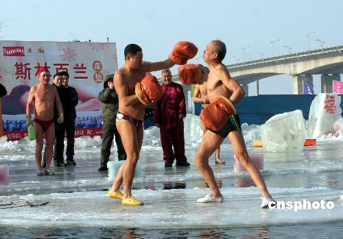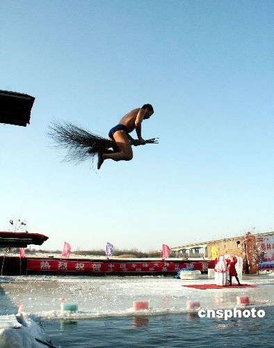 新春佳節(jié),哈爾濱十大名片之一的冬泳表演不斷升級,滑稽性、科學(xué)性、專業(yè)性,使游人流連忘返。中新社發(fā) 姚庭山 攝