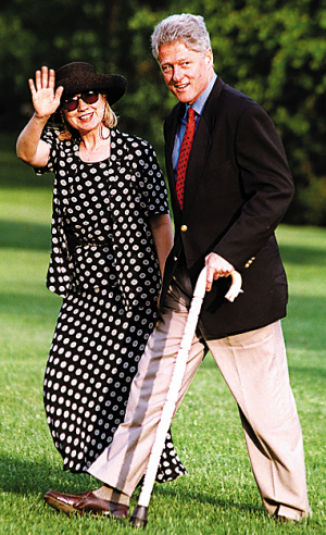 1997年,希拉里與克林頓出席一個公開場合,將圖案情意結(jié)發(fā)揮得淋漓盡致,黑底白波點(diǎn)連外套長裙將她幻化成一張“人肉包裝紙”,她硬撐著說:“那套衣服不是這么糟,只是較為令人眼花而已!