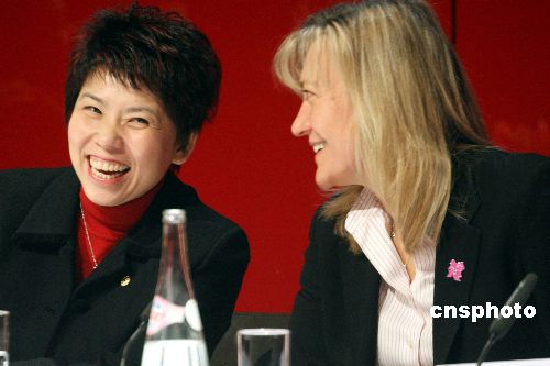 當(dāng)?shù)貢r間11日下午,北京奧組委奧運(yùn)村部副部長鄧亞萍(左)和倫敦奧組委的官員、網(wǎng)球運(yùn)動員出身的Debbie Jevans(右)在“婦女與奧運(yùn)”論壇上交談。