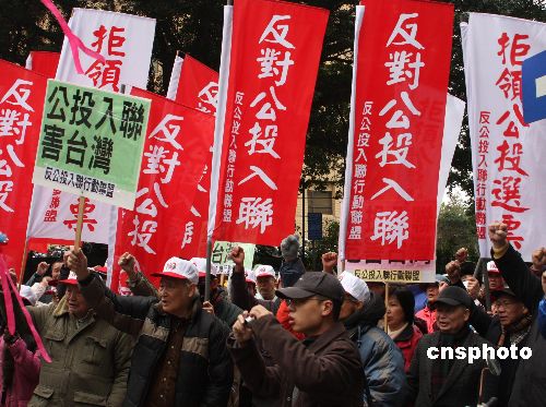 臺灣“中央選舉委員會”將從2月27日起主辦十場“入聯(lián)公投”、“返聯(lián)公投”意見發(fā)表會或辯論會,14日是反方代表申請期限。臺灣勞動黨主席吳榮元、民主行動聯(lián)盟總召集人黃光國到“中選會”遞交公投反方代表申請書,他們還率領“反公投入聯(lián)行動聯(lián)盟”成員在“中選會”前表達訴求,群眾高舉“反對公投入聯(lián),拒領公投票”等標語,主張拒領公投票,要求中國國民黨與民主進步黨拋棄“公投入聯(lián)”、“公投返聯(lián)”議題。中新社發(fā) 耿軍 攝