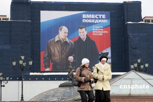 3月1日,在莫斯科紅場旁邊,現(xiàn)任俄羅斯總統(tǒng)普京與政府第一副總理、下屆總統(tǒng)的熱門侯選人梅德韋杰夫的巨幅海報(bào),上書“我們攜手贏取勝利”十分醒目。梅德韋杰夫曾多次表示,他若當(dāng)選后將繼續(xù)執(zhí)行普京路線。3月2日,俄羅斯將舉行總統(tǒng)大選。中新社發(fā) 田冰 攝