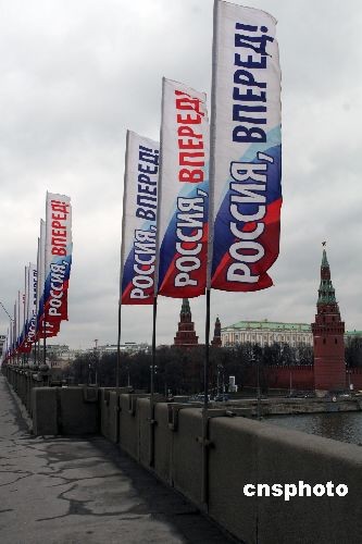 克里姆林宮旁一橋梁上的旗幟,上書(shū)“前進(jìn),俄羅斯!”3月2日,俄羅斯將舉行新一屆總統(tǒng)大選。俄總統(tǒng)普京2月29日發(fā)表告人民書(shū),呼吁選民“為俄羅斯的未來(lái)投上自己的一票”。